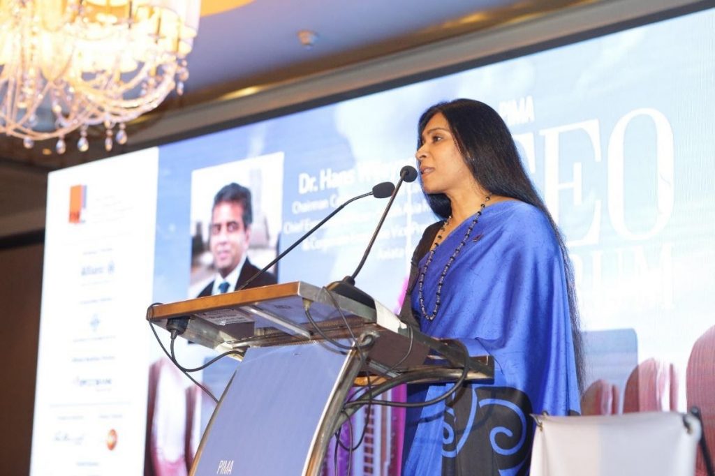 Treasurer PIMA – Shiranthi Theverapperuma reading out the profile of the key-note speaker Dr. Hans Wijayasooriya.
